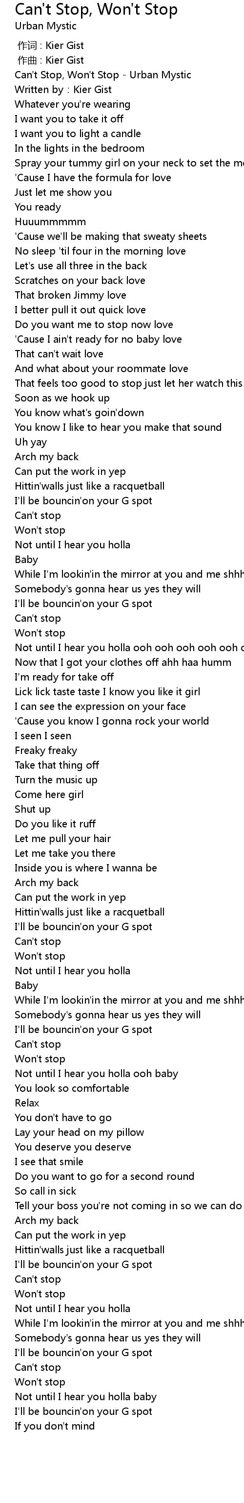 | [00:00.10] | Can' t Stop, Won' t Stop Urban Mystic |