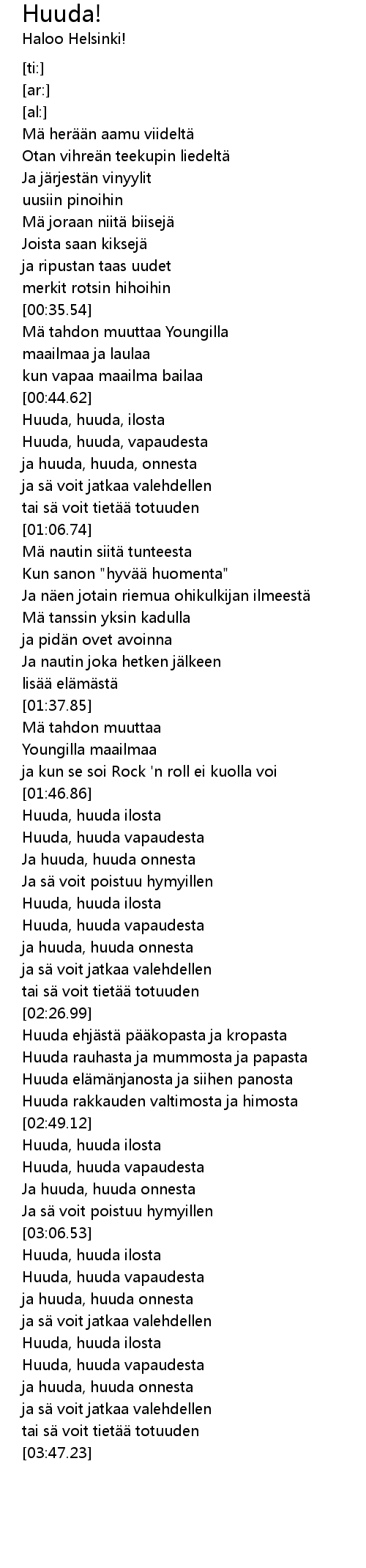 | [01:47.11] | Huuda, huuda ilosta |