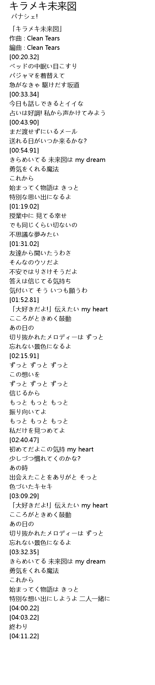 | [00:55.52] | きらめいてる 未来図は my dream |