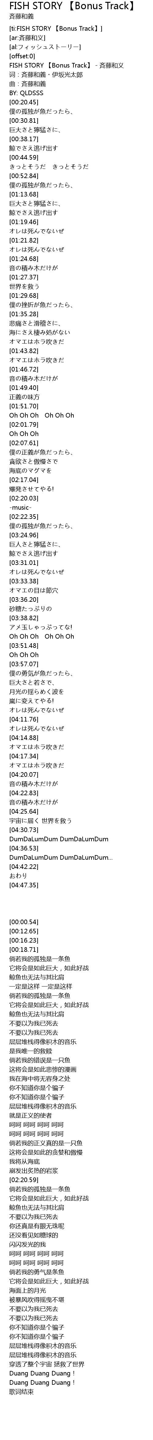 | [00:00.54] | FISH STORY 【Bonus Track】 - 斉藤和义 |