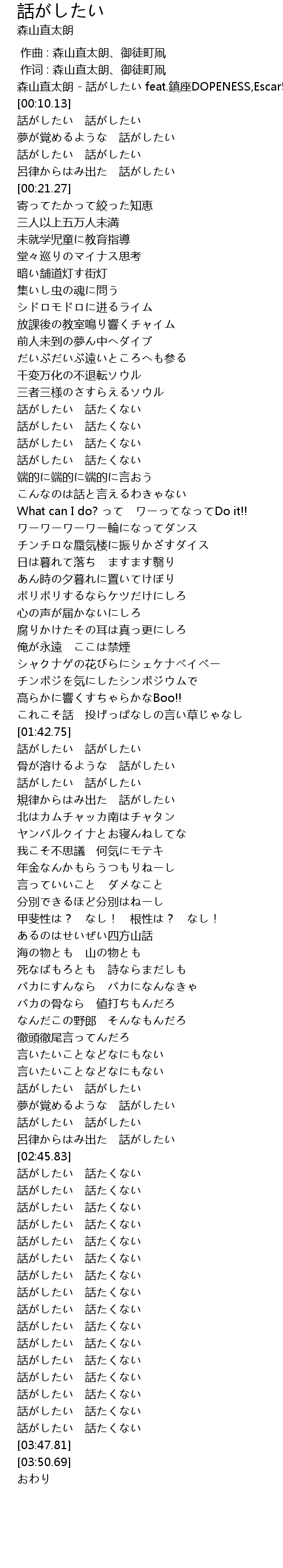| [00:00.88] | 森山直太朗 - 話がしたい feat.鎮座DOPENESS,Escar5ot |