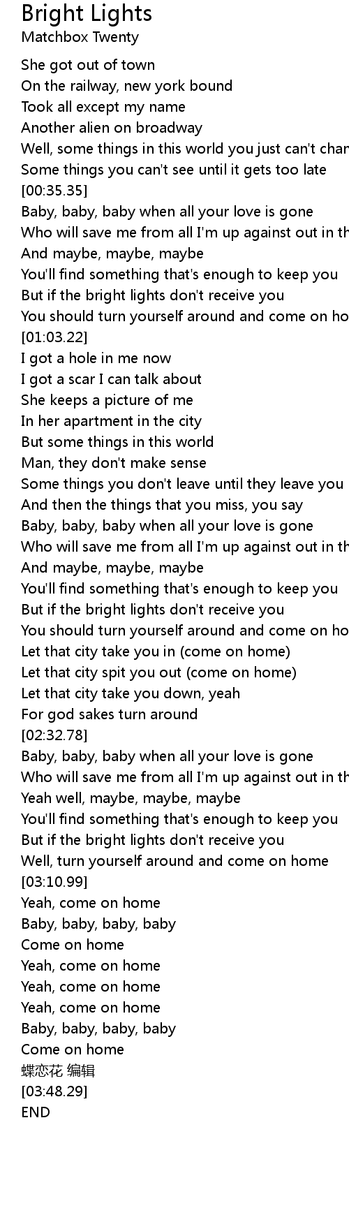 | [03:00.46] | But if the bright lights don' t receive you |
