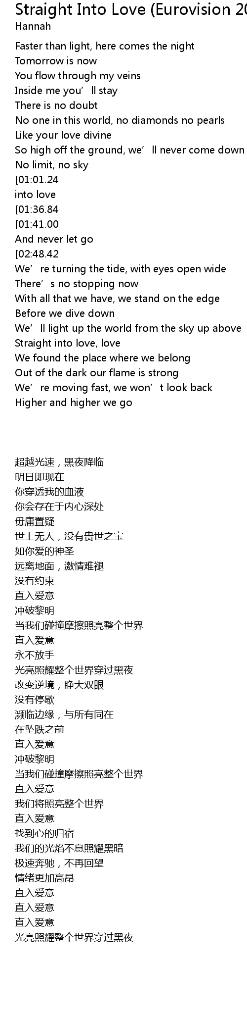 | [00:46.38][01:01.24][01:33.24][01:48.13][02:25.71][02:33.15][02:40.68] | Straight into love |