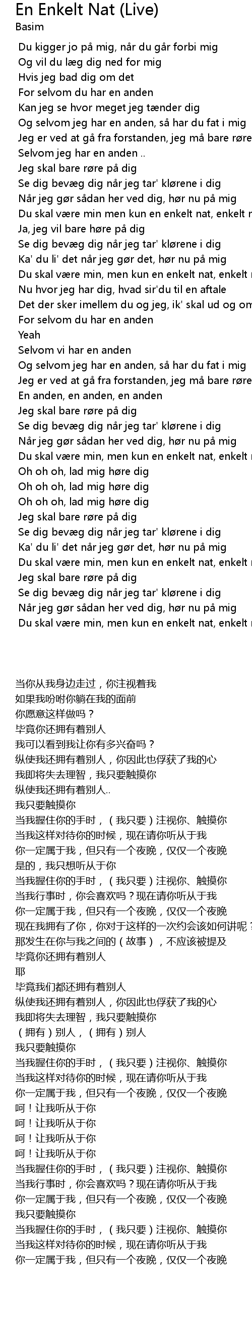 | [01:28.519] | Du skal v re min men kun en enkelt nat, enkelt nat, enkelt nat |