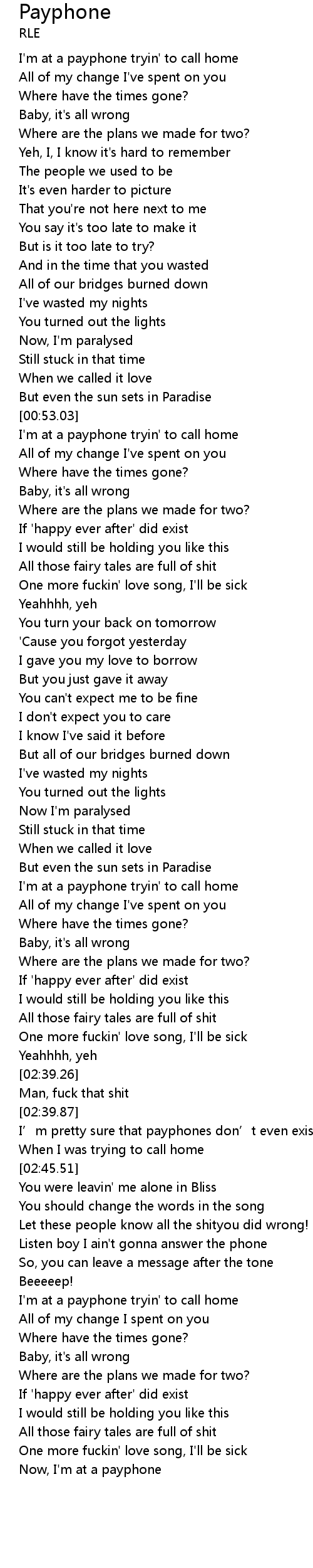 | [00:54.27] | I'm at a payphone tryin' to call home |