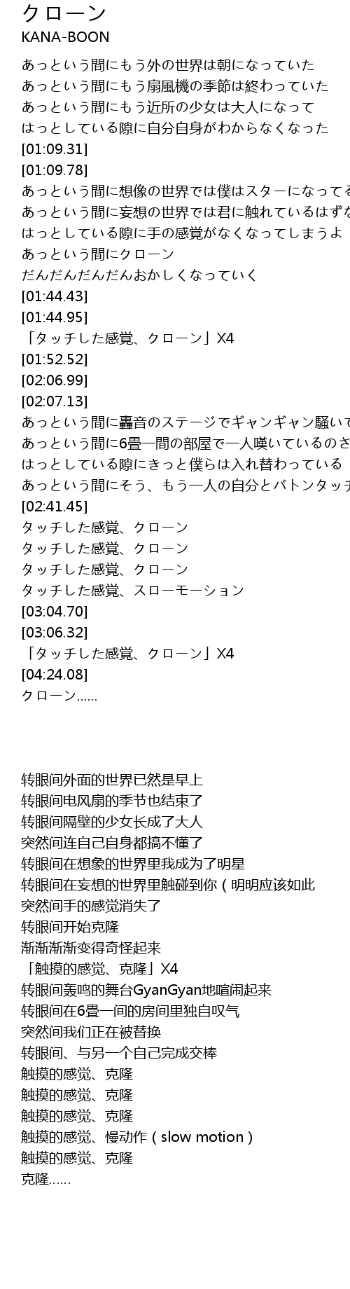 | [04:18.09] | 「タッチした感覚、クローン」X4 |