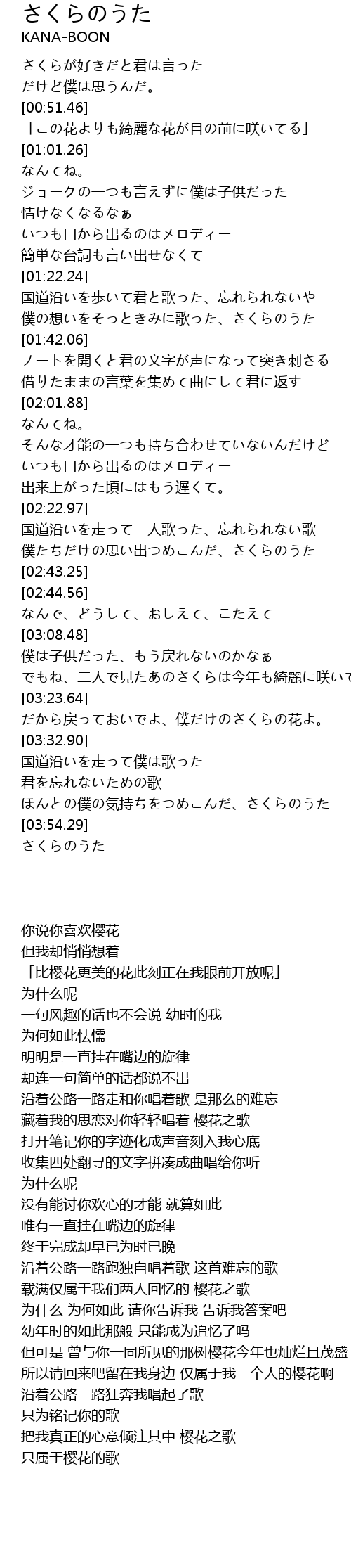 | [03:44.12] | ほんとの僕の気持ちをつめこんだ、さくらのうた |
