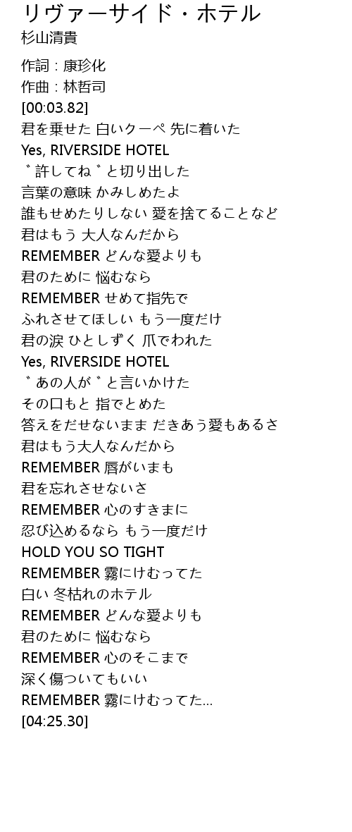 | [00:37.51] | Yes, RIVERSIDE HOTEL |