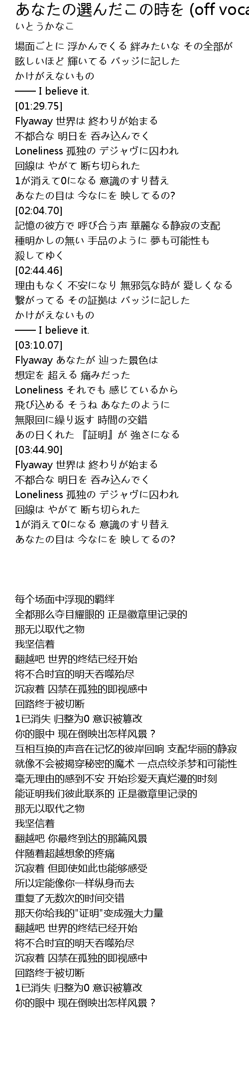 | [03:10.54] | Flyaway あなたが 辿った景色は |