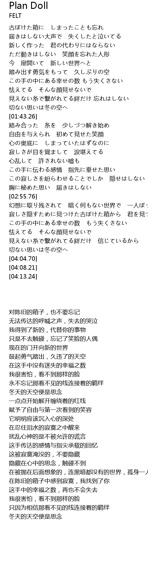 | [00:49.53] | ただ動きはしない 笑顔を忘れた人形 |