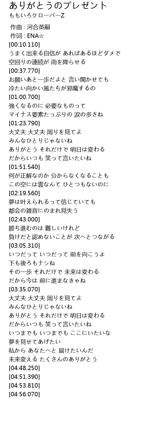 | [04:35.500] | 未来変える たくさんのありがとう |