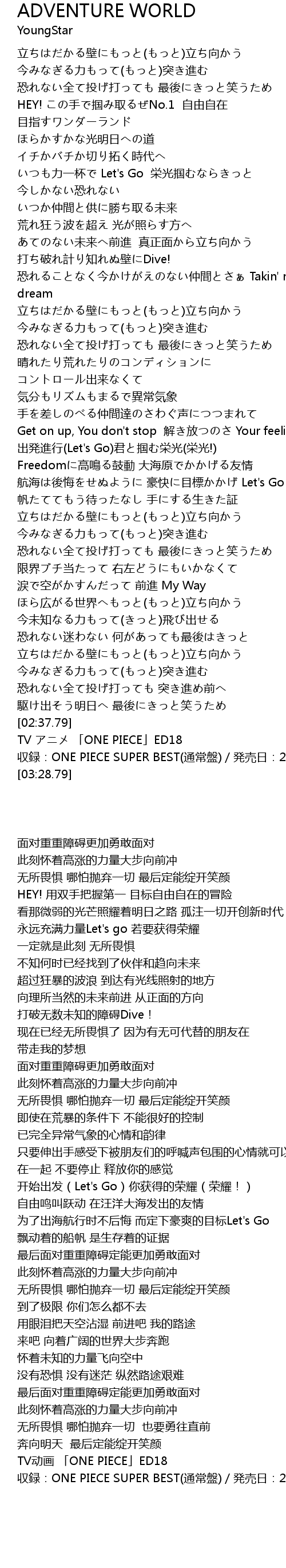 | [02:49.79] | 収録:ONE PIECE SUPER BEST(通常盤)/発売日:2007/03/07 |