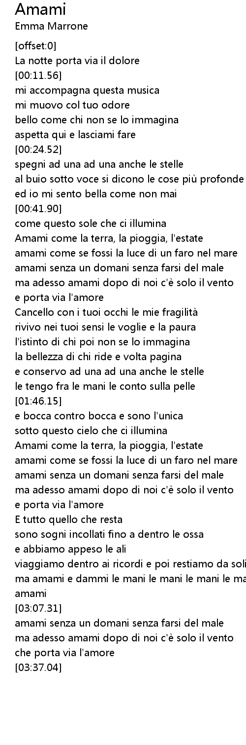 | [01:11.96] | ma adesso amami dopo di noi c'e solo il vento |