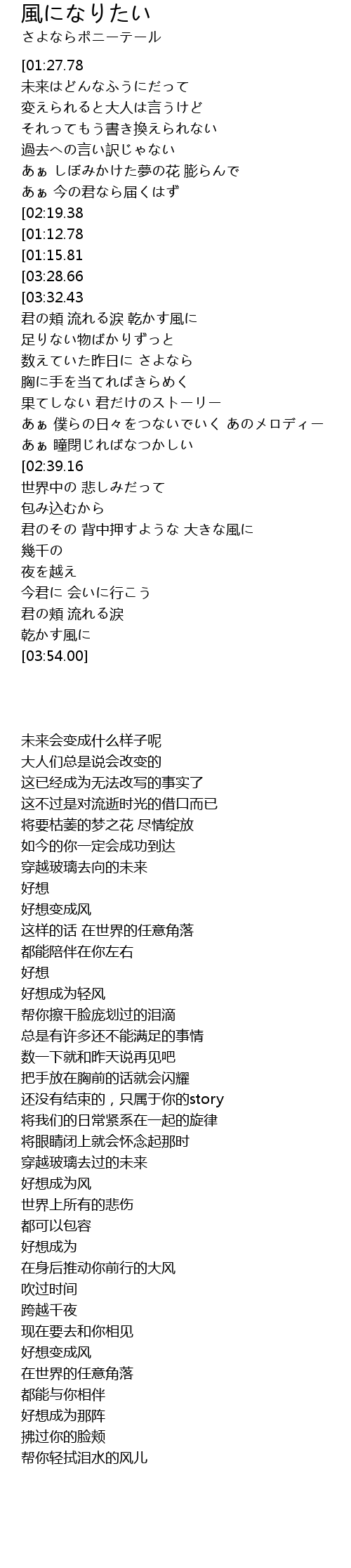 | [02:24.96][02:39.16][03:22.27][03:35.63] | あぁ風に 風になりたい |