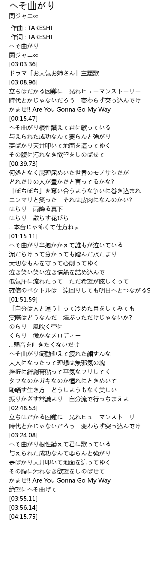 | [03:25.19] | へそ曲がり根性讃えて君に歌っている |