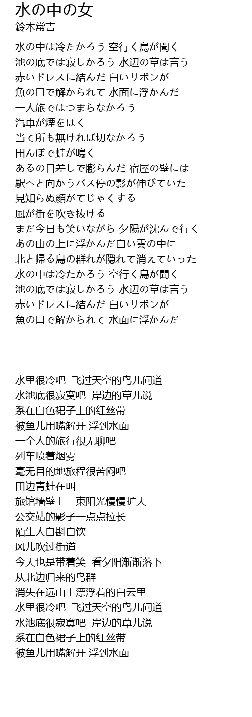 | [04:10.500] | 水の中は冷たかろう 空行く鳥が聞く |
