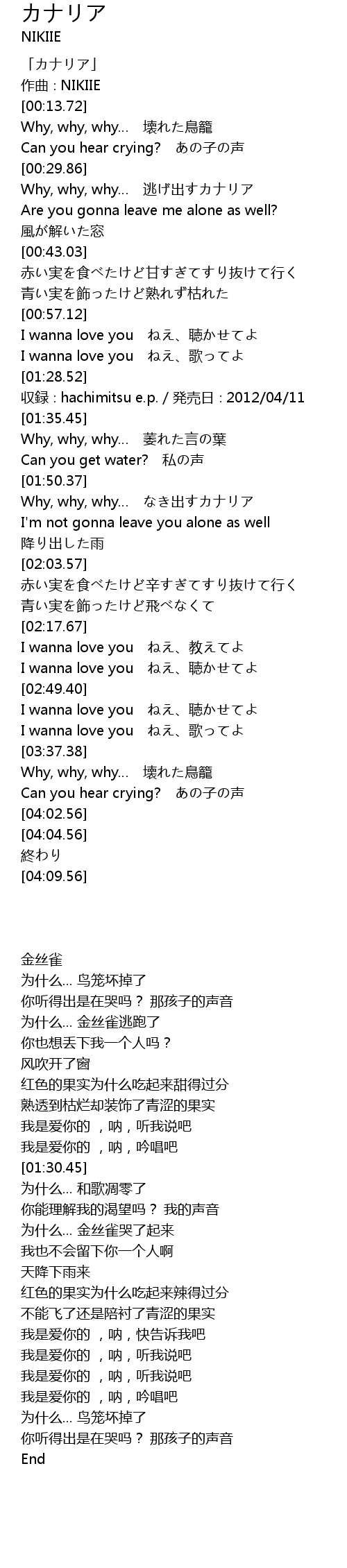 | [00:30.62] | Why, why, why… 逃げ出すカナリア |