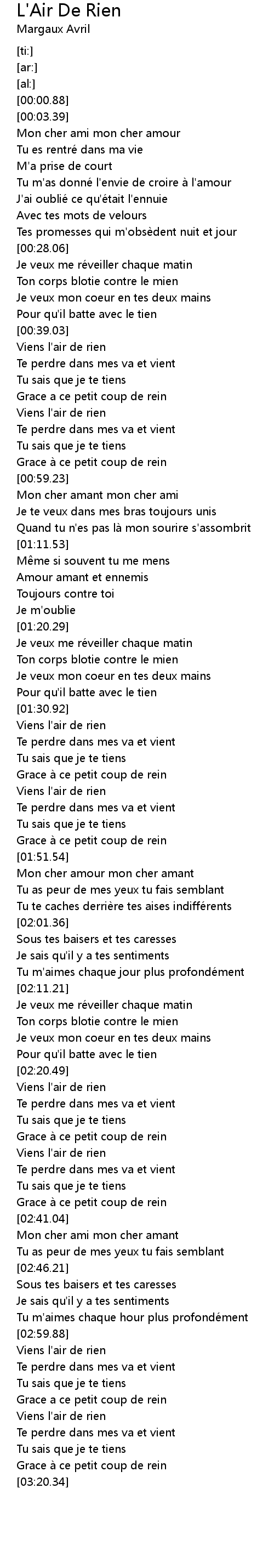 | [02:16.29] | Je veux mon coeur en tes deux mains |