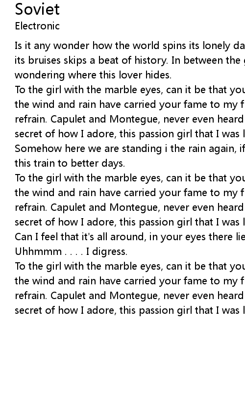 To the girl with the marble eyes, can it be that you've taken me by surprise, the wind and rain have carried your fame to my front door in spite of my heart's refrain. Capulet and Montegue, never even heard of me and you. I'll keep this secret of how I adore, this passion girl that I was looking for.
