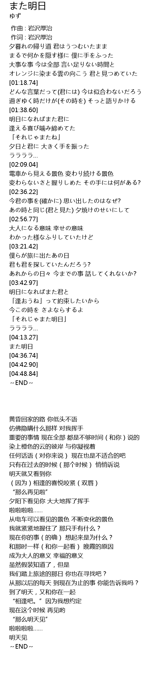 | [00:39.48] | 夕暮れの帰り道 君はうつむいたまま |