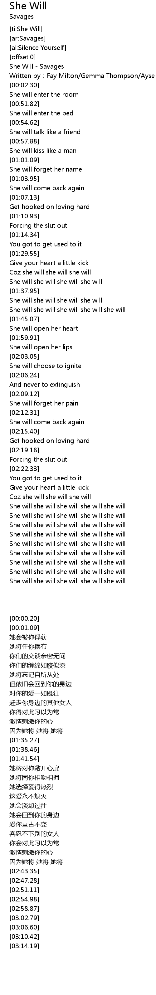 | [00:01.09] | Written by:Fay Milton/Gemma Thompson/Ayse Hassan/Jehnny Beth |