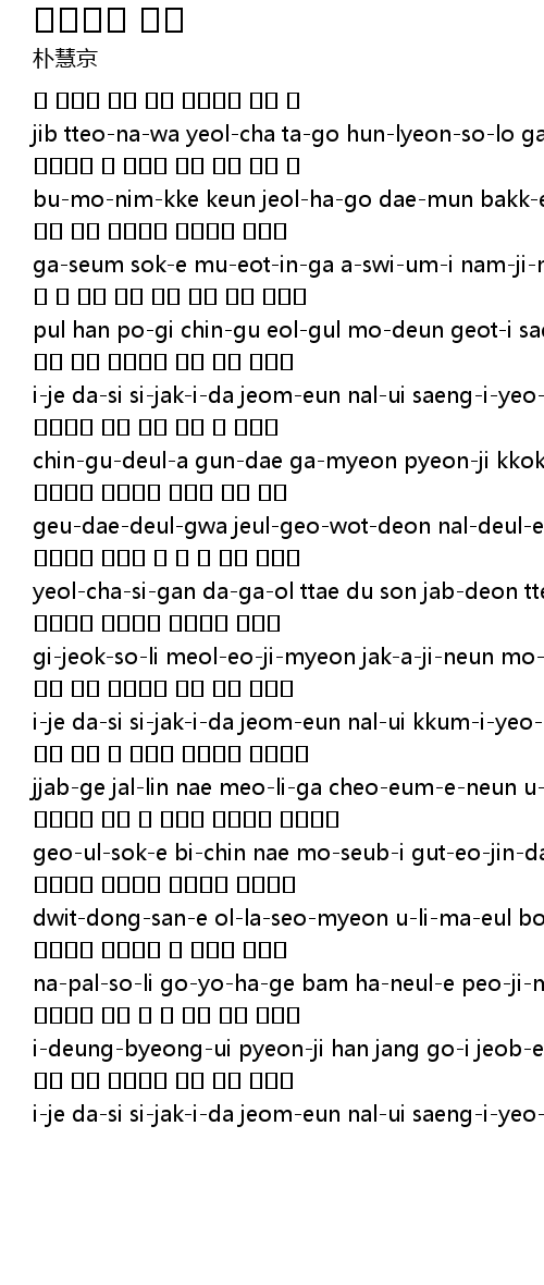 | jib tteo-na-wa yeol-cha ta-go hun-lyeon-so-lo ga-neun nal- | |