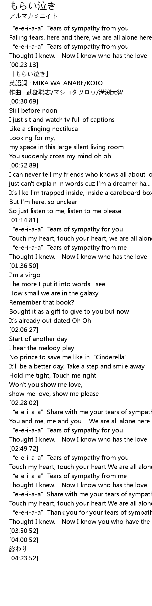 | [03:29.25] | " eeiaa" Share with me your tears of sympathy |