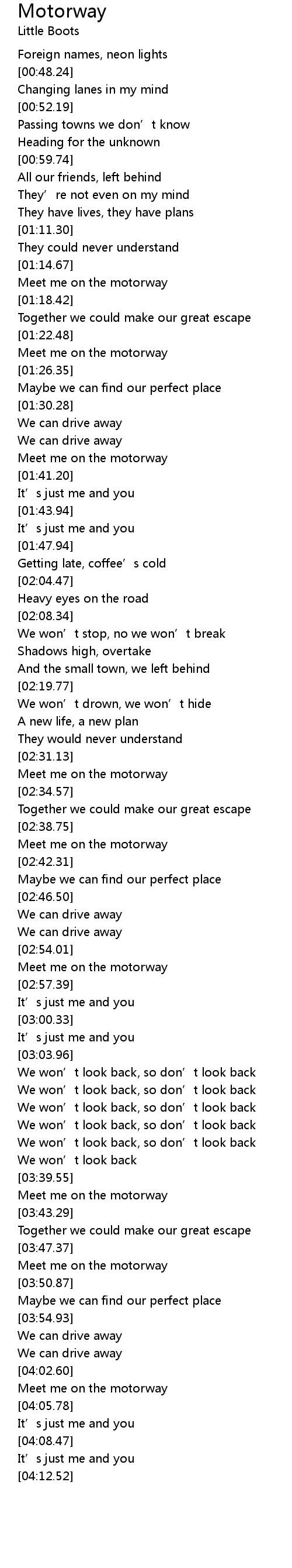 | [03:47.88] | Meet me on the motorway |