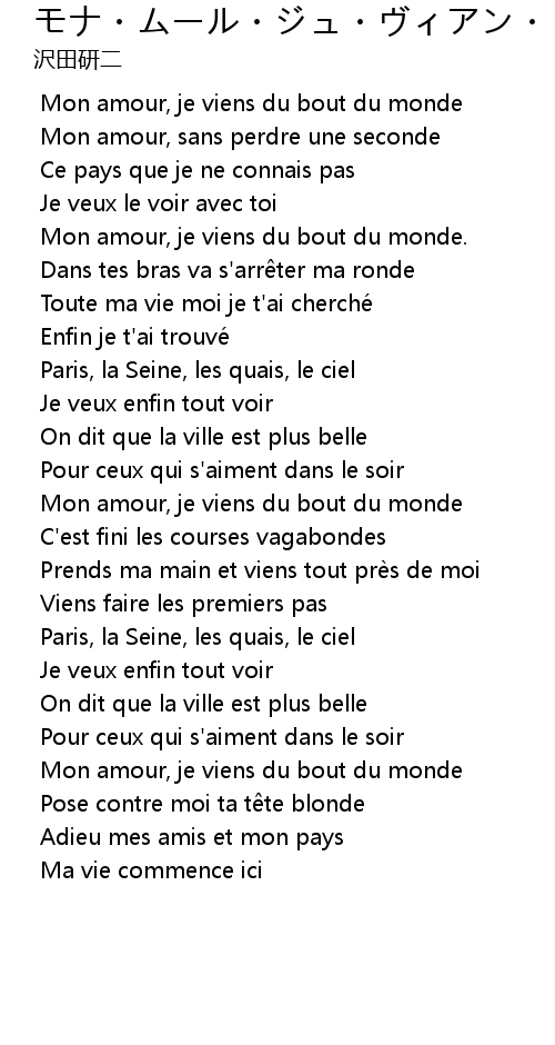 | [01:21.704] | Mon amour, je viens du bout du monde |