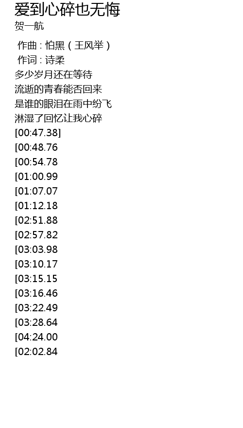 | [04:17.88][03:28.64][01:50.20] | 爱你爱到心碎也无悔 |