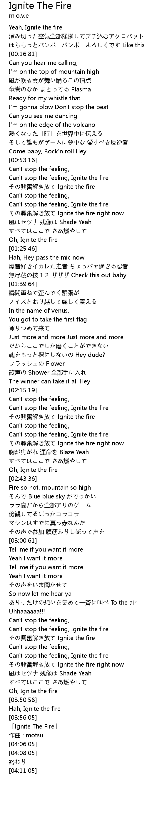 | [03:20.97] | Can' t stop the feeling, Ignite the fire |