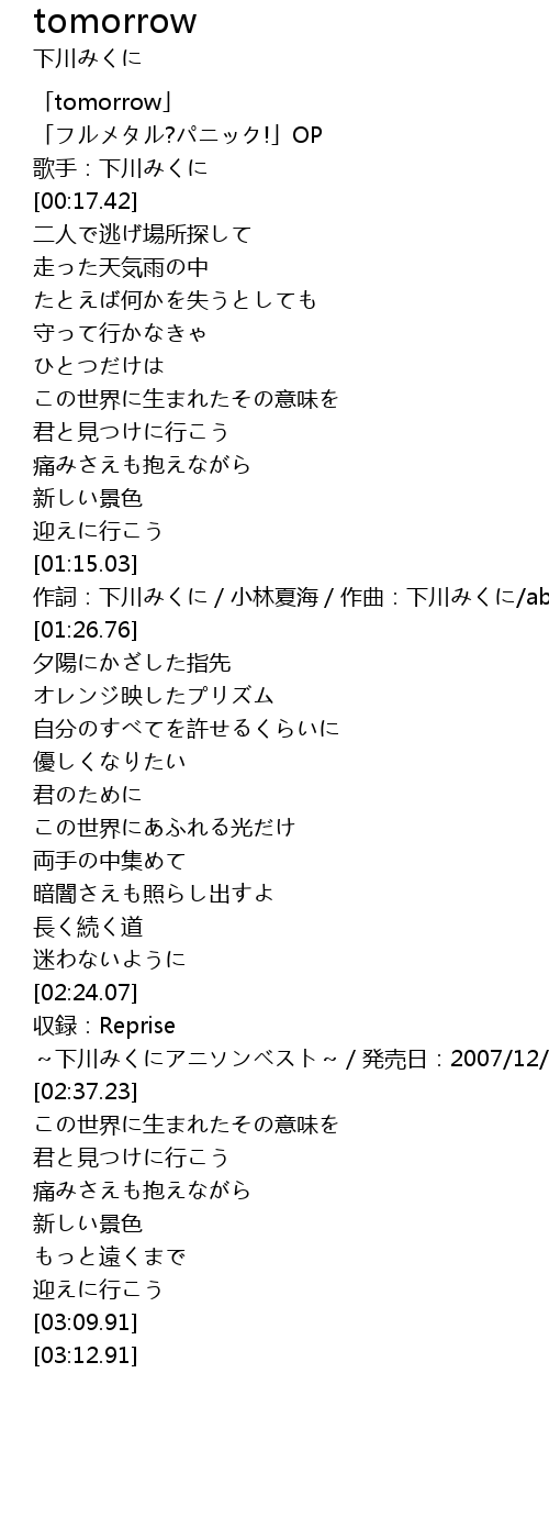 | [02:27.07] | 収録:Reprise ~下川みくにアニソンベスト~/発売日:2007/12/19 |
