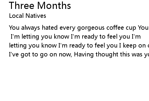 | You always hated every gorgeous coffee cup You could never see them; That to him they meant the world [Hook:] I'm letting you know I'm ready to feel you I'm letting you know I'm ready to feel you I keep on calling just to get the machine I've got to go on now, Having thought this was your last year [Hook] |