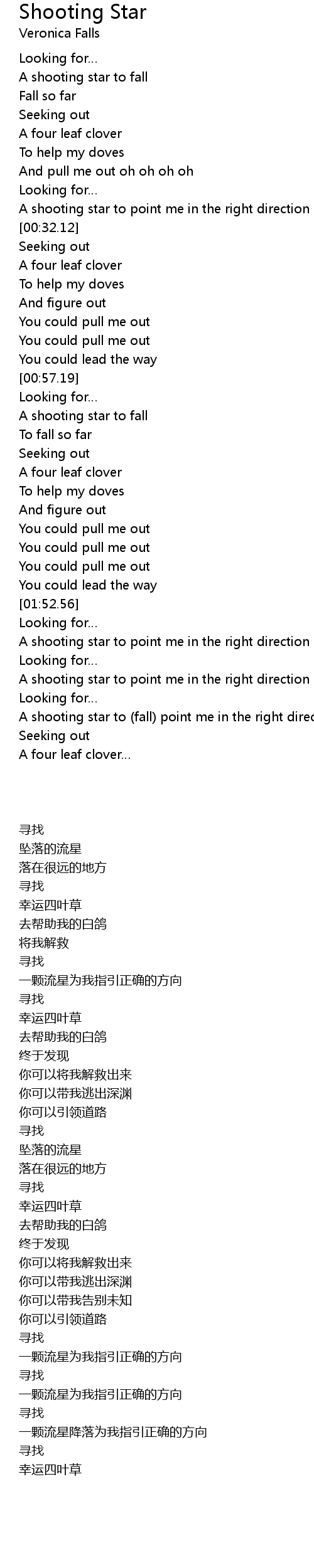 | [02:15.42] | A shooting star to (fall) point me in the right direction |