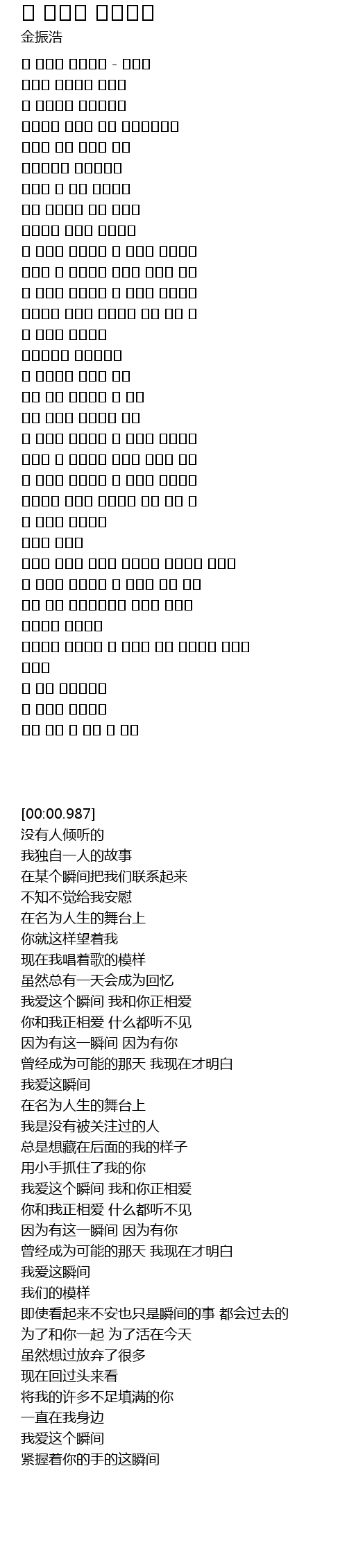 | [00:00.987] | 이 순간을 사랑해요 - 김진호 |