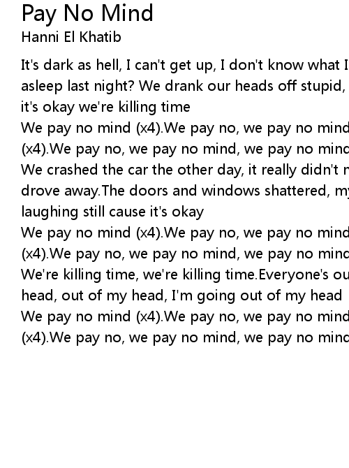 We pay no mind (x4).We pay no, we pay no mind, we pay no mind.We pay no mind (x4).We pay no, we pay no mind, we pay no mind |