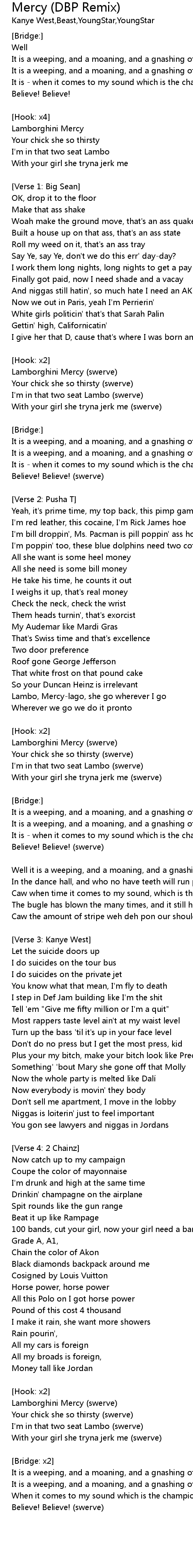 | Lambo, Mercylago, she go wherever I go | |