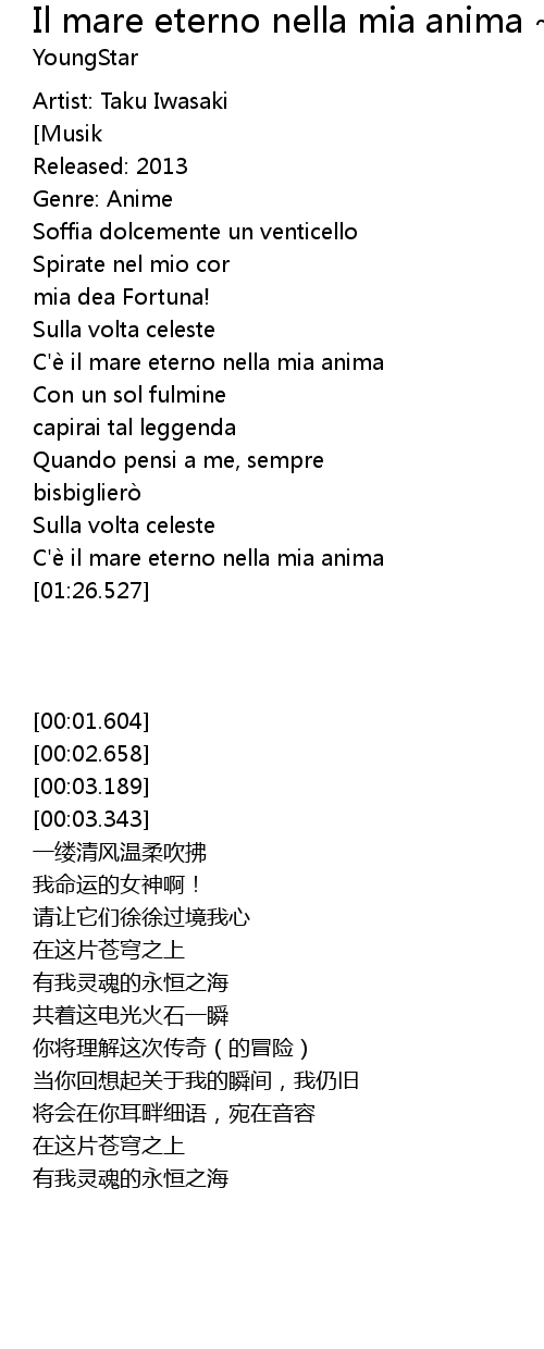 | [01:26.527] | C'e il mare eterno nella mia anima |