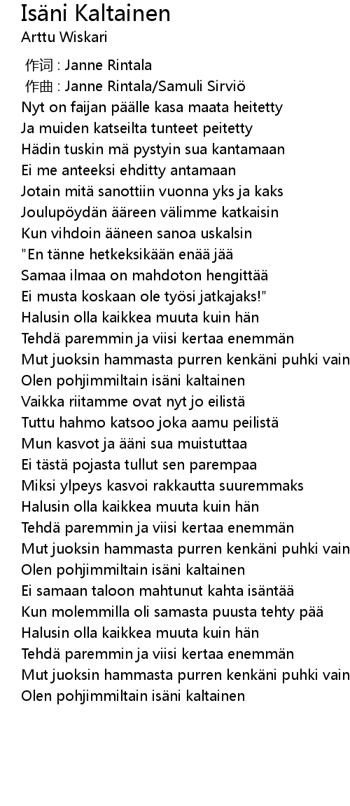 | [01:32.11] | Olen pohjimmiltain isäni kaltainen |