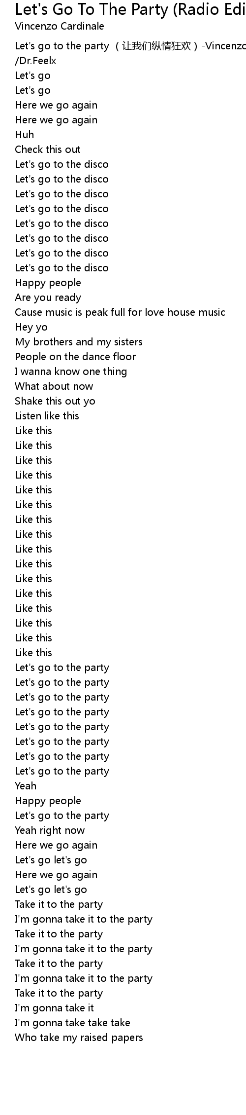 | [00:00.00] | Let' s go to the party ràng wǒ men zòng qíng kuáng huān Vincenzo Cadinale Dr. Feelx |