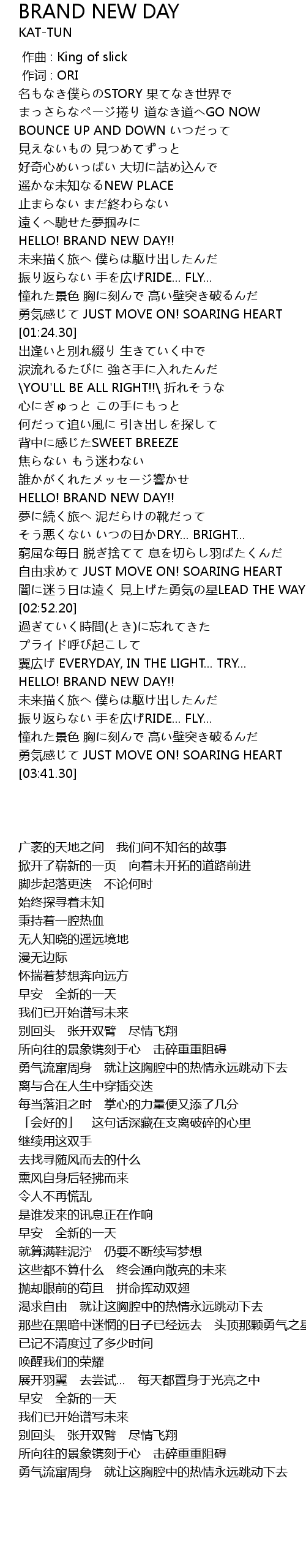 | [02:11.65] | HELLO! BRAND NEW DAY!! |