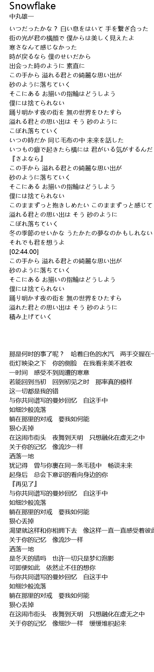 | [02:25.90] | 冬の季節のせいかな うたかたの夢なのかもしれない |