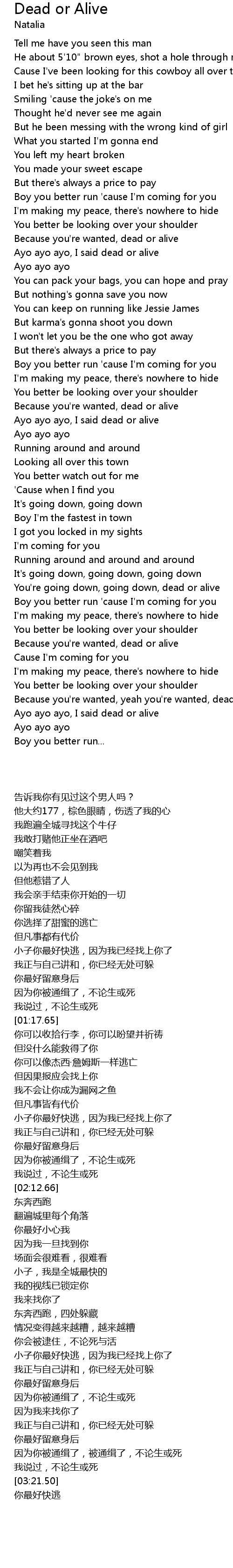 | [03:09.36] | Because you're wanted, yeah you're wanted, dead or alive |