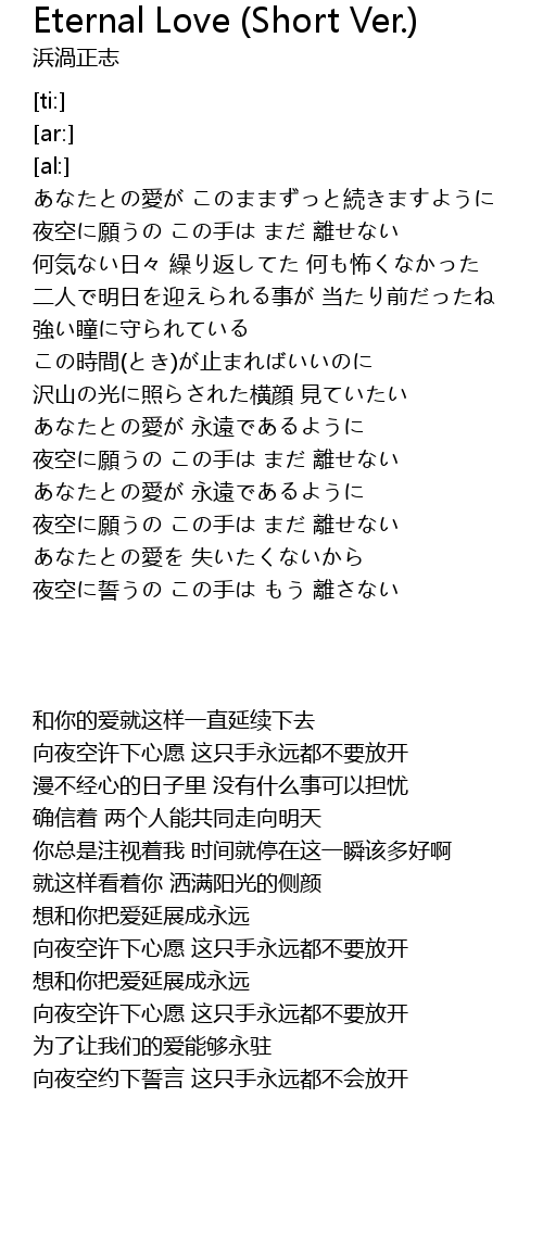| [00:01.64] | あなたとの愛が このままずっと続きますように |