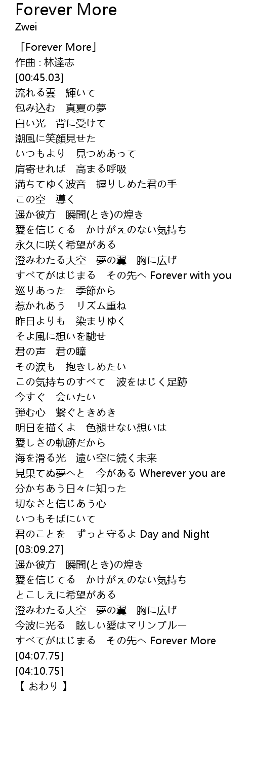 | [03:59.77] | すべてがはじまる その先へ Forever More |