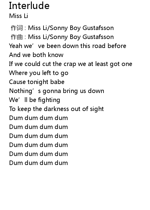 | [00:00.000] | 作词 : Miss Li/Sonny Boy Gustafsson |