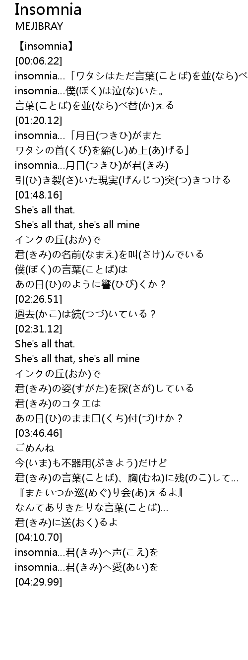 | [01:08.52] | insomnia…僕(ぼく)は泣(な)いた。 |