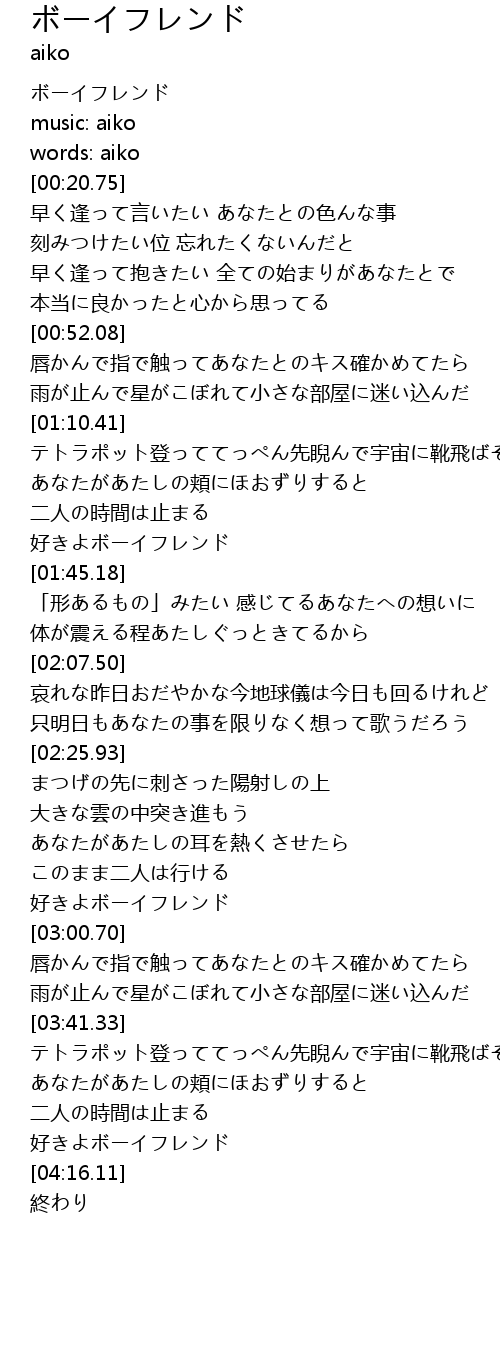 | [03:42.29] | テトラポット登っててっぺん先睨んで宇宙に靴飛ばそう |