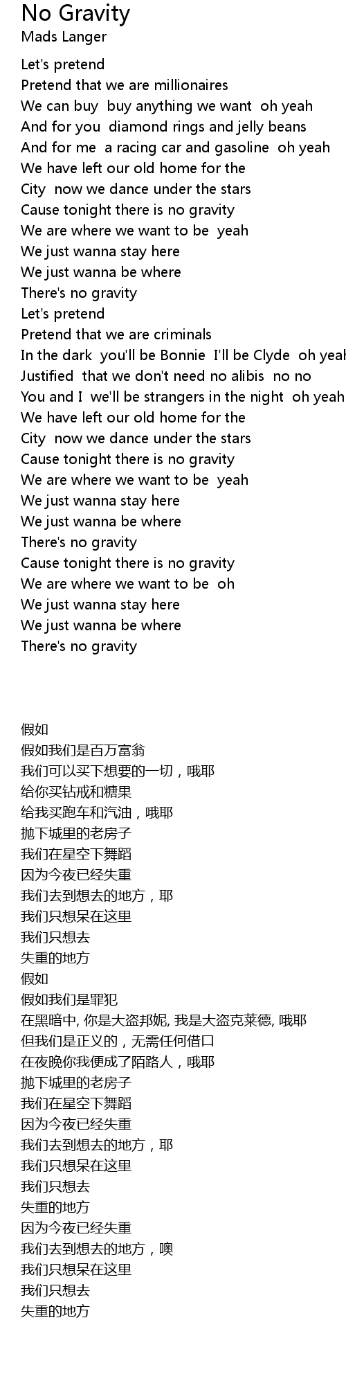 Cause tonight there is no gravity |