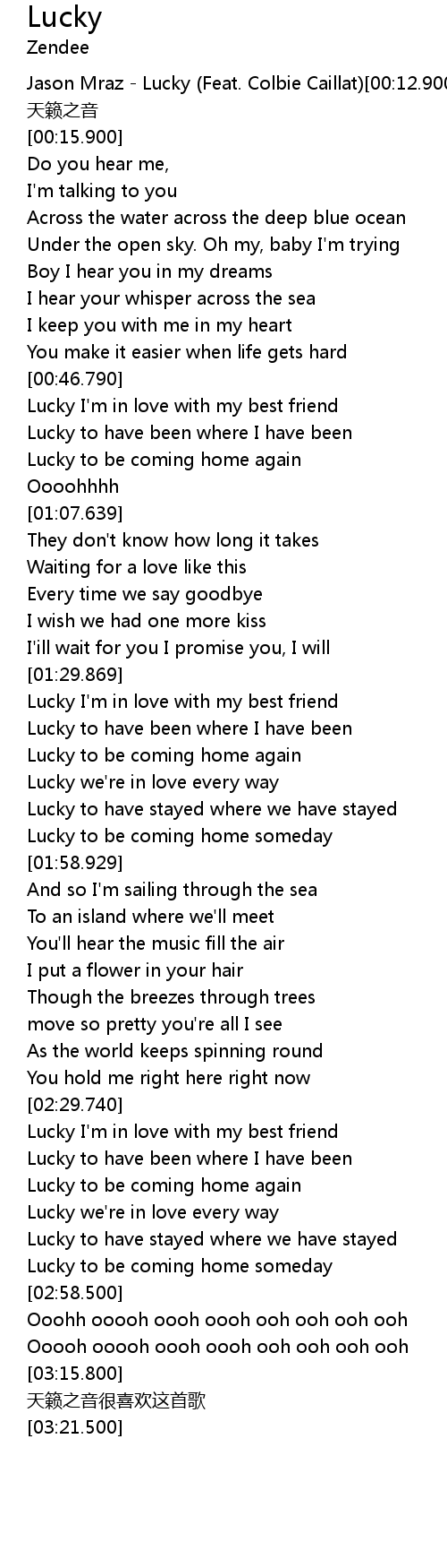 | [00:-2.00]Jason Mraz - Lucky (Feat. Colbie Caillat)[00:12.900][00:-1.00] | Lyrics tian lai zhi yin |